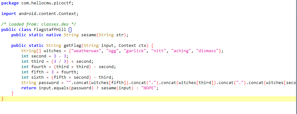 FlagstaffHill berisikan sebuah function yang bernama getflag, yang dari namanya saja sudah memberikan sebuah clue. Di dalam function tersebut ada sebuah array bernama witches yang berisi enam string. Kemudian ada beberapa variable integer dan sebuah string bernama password. Dalam string password terdapat concat yang berfungsi untuk menambahkan atau menggabungkan dua buah string menjadi satu. Kita bisa lihat juga concat dilakukan berkali-kali untuk menggabungkan string dalam array witches. String password= "".concat(witches[fifth]).concat(".").concat(witches[third]).concat(".").concat(witc hes[second]).concat(".").concat(witches[sixth]).concat(".").concat(witches[3]).conc at(".").concat(witches[fourth]); Index dari array tersebut adalah variable-variable integer yang diberikan diatasnya, jadi jika kita ingin mengetahui password kita harus menyelesaikan teka- teki integer terlebih dahulu. Int second = 3 – 3 = 0 Int third = ( 3/3 ) + second = 1 + 0 = 1 Int fourth=( third + third ) – second = ( 1 + 1 ) – 0 = 2 Int fifth = 3 + fourth = 3 + 2 = 5 Int sixth = (fifth + second ) – third = ( 5 + 0 ) -1= 4 Jangan lupa ada concat(“.”) yang menambahkan . (titik) diantara setiap string. String password akan menjadi : dismass.ogg.weatherwax.aching.nitt.garlick