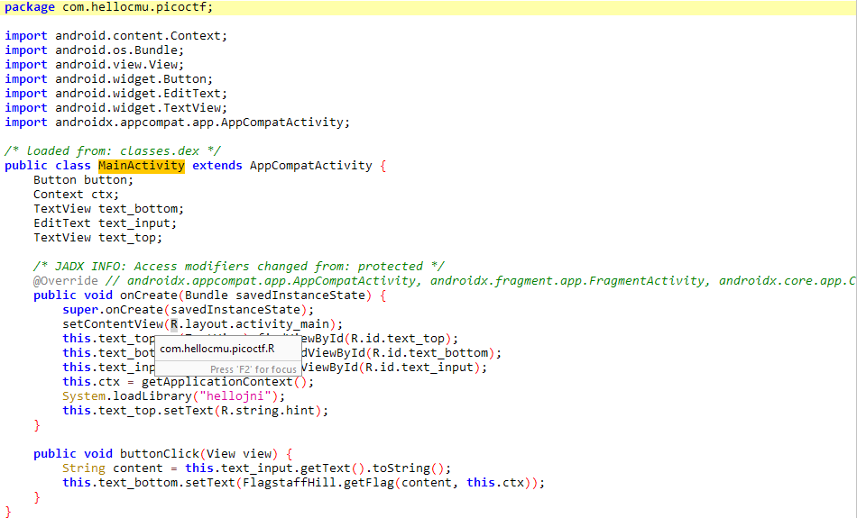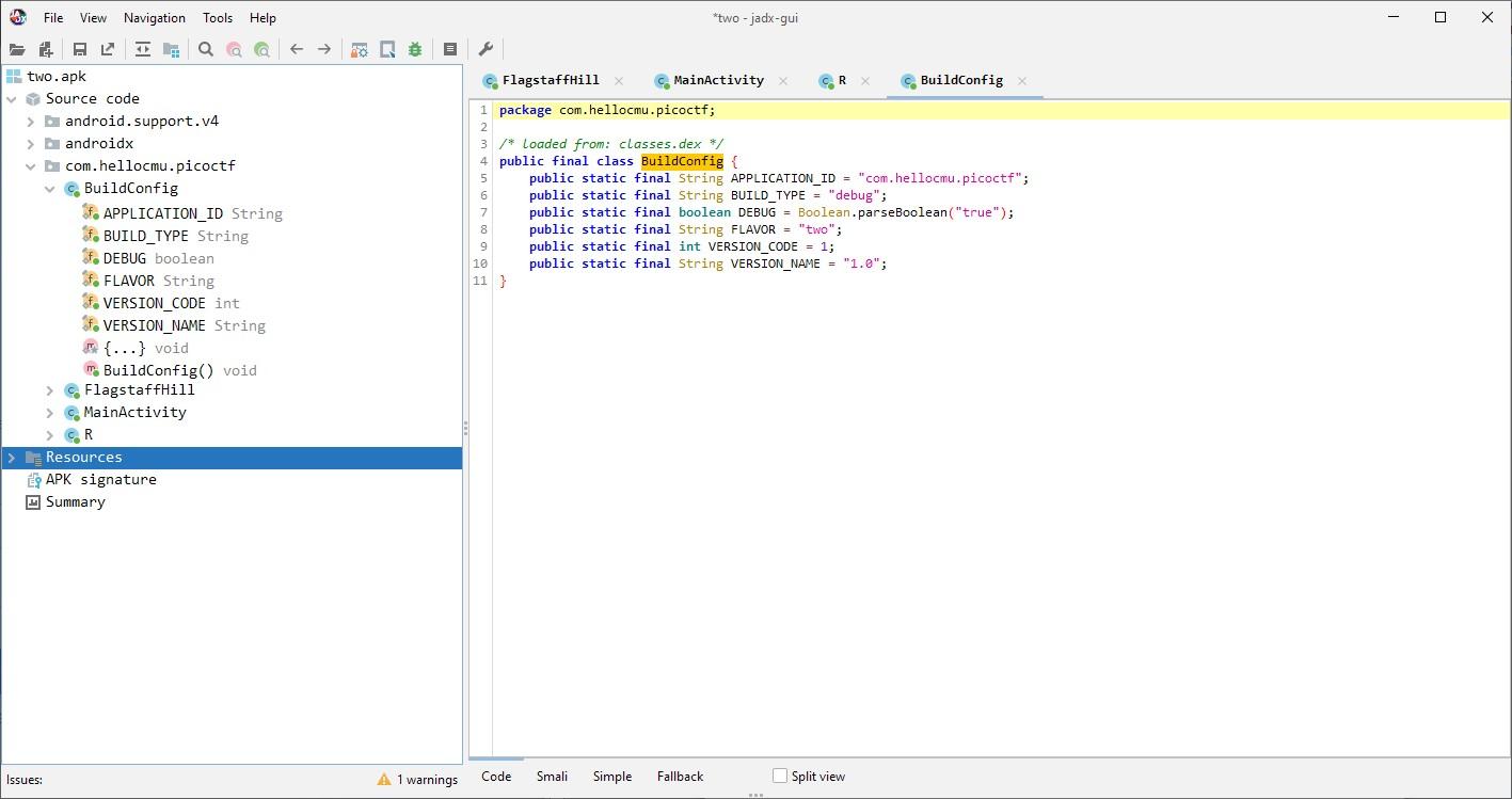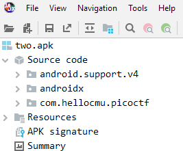 Pada menu Source code terdapat dropdown menu bernama com.hellocmu.picoctf.