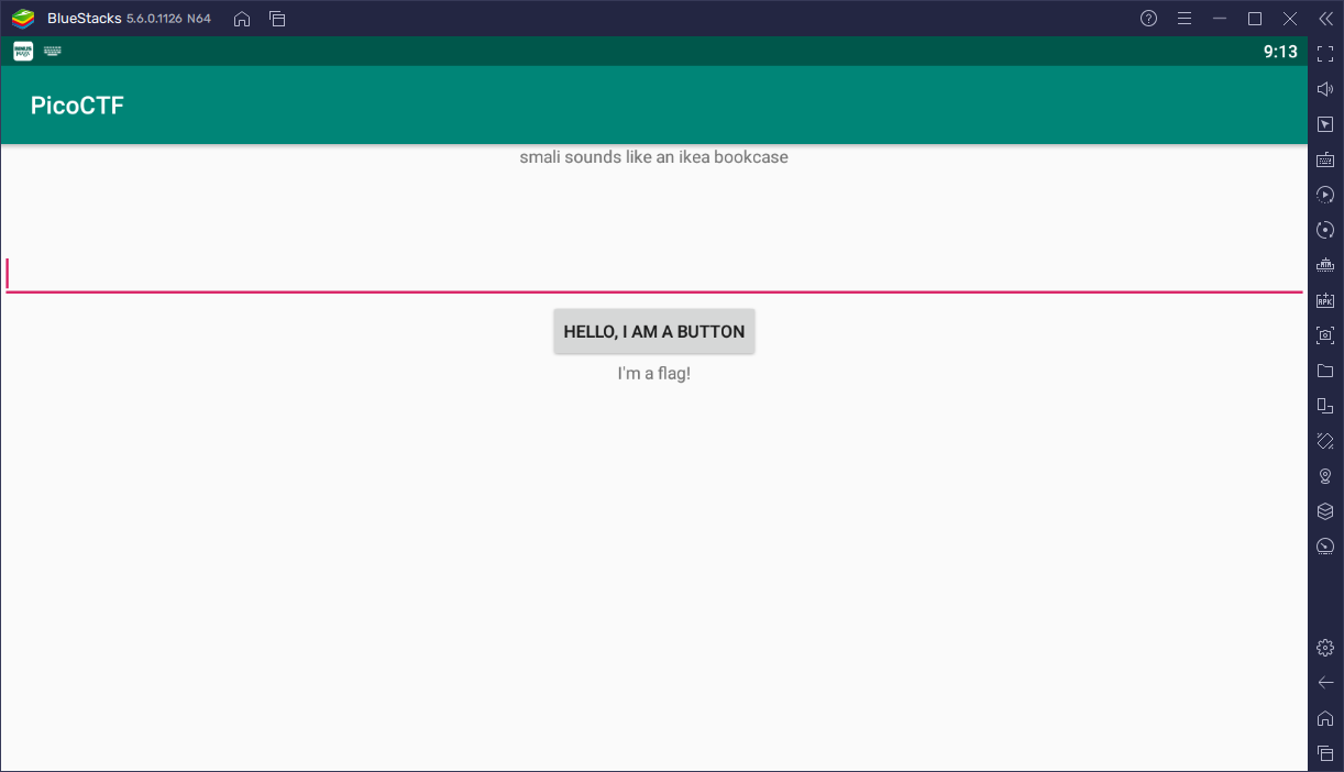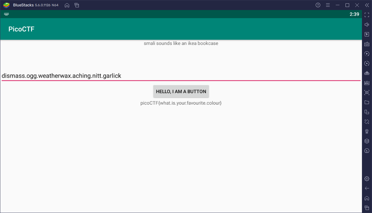 Dengan seketika app tersebut mengeluarkan flagnya, yaitu Flag: picoCTF{what.is.your.favourite.colour}