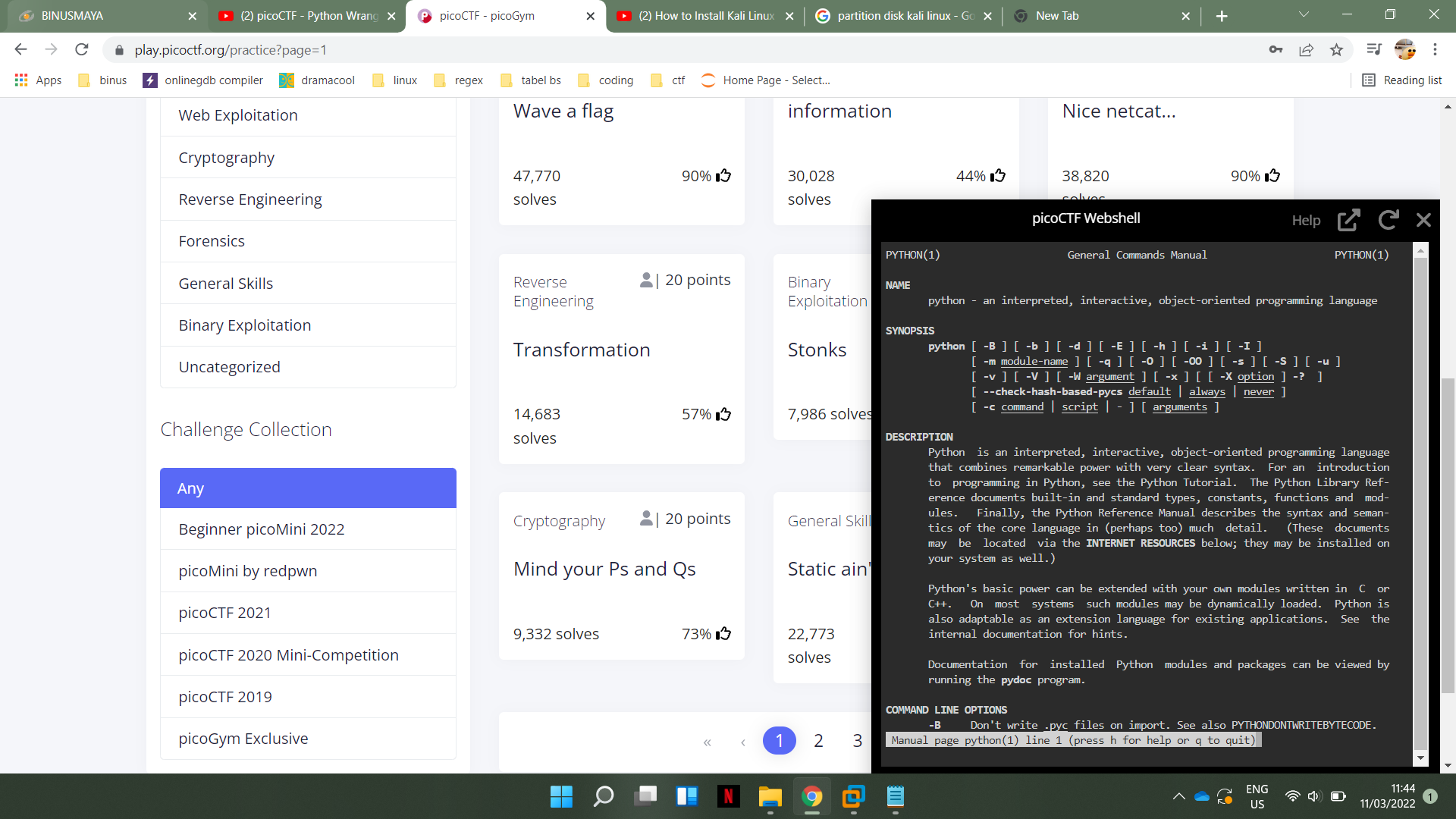 Di tahap ini, saya menggunakan arahan pada hint 2 dan menampilkan hal berikut. Tampilan ini menunjukkan manual page pada python yang berisi command-command yang sering digunakan. Pada tampilan ini, kita disuruh membaca terlebih dahulu untuk dapat melanjutkan ke tahap berikutnya dengan command lain.