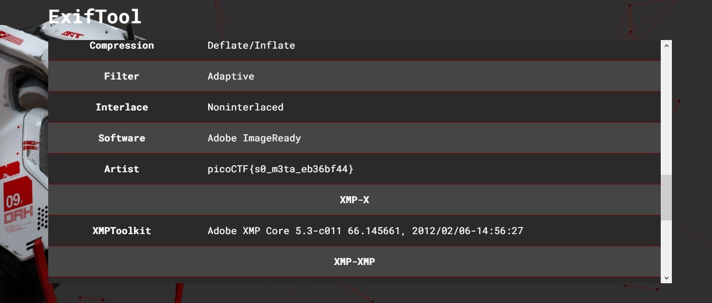 Berdasarkan judulnya, sepertinya untuk menyelesaikan soal ini melibatkan kata “meta”, pada konteks file, meta dapat berarti metadata pada file tersebut. Metadata sebuah file adalah data yang memberikan informasi mengenai file itu sendiri. Pada gambar, metadata yang sering kita jumpai biasa berupa lokasi gambar, device pengambil gambar, software pengedit gambar, dsb. Untuk melihat metadata suatu file dapat dilakukan dengan tools seperti exiftool.