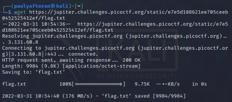 Pada challenge ini diberikan sebuah file "flag.txt". Setelah file tersebut di download dengan "wget", saya mencoba menampilkan isi file tersebut dengan command "cat".