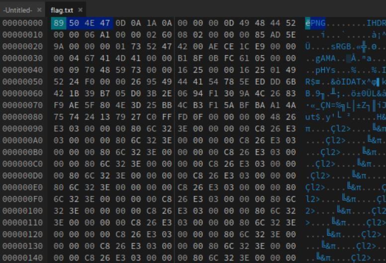 Setelah muncul, ternyata isi dari file "flag.txt" tersebut terlihat menampilkan karakter - karakter aneh. Dari hint yang diberikan menyinggung tentang tipe file, maka mungkin file ini aslinya bukan txt. Jadi saya mencoba mengeceknya dengan dengan hex editor untuk melihat struktur filenya. Disini saya menggunakan website "HexEd.it".