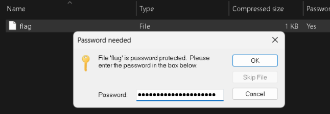 Lalu saya berpikir, mungkin saja flag yang sepotong ini merupakan password dari zip file sebelumnya. Jadi saya mencoba memasukkannya sebagai password.