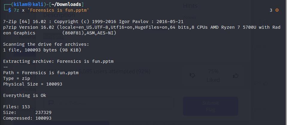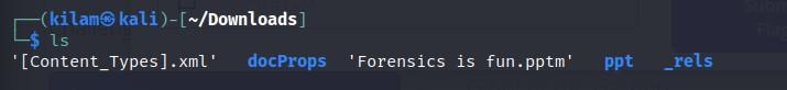 Dan ternyata terdapat banyak folder beserta file di dalam file .pptm tersebut. Oleh karena itu di sini saya menggunakan command "7z x" untuk mengextract semua folder beserta isi filenya.