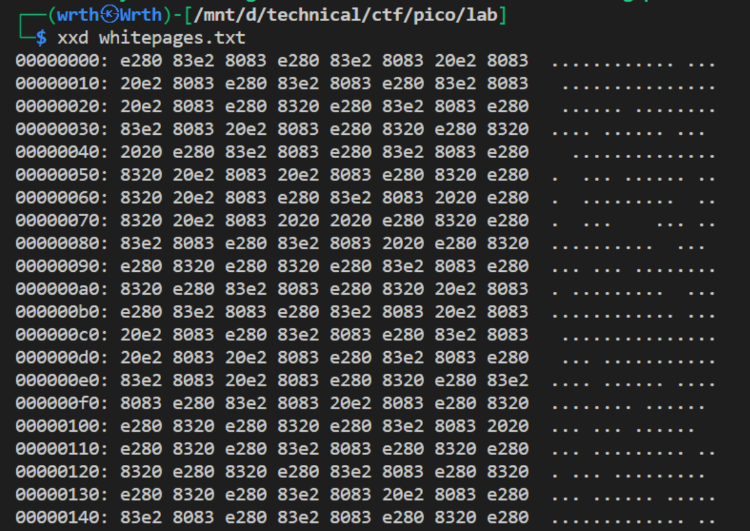 Note: xxd bagi yang belum tahu adalah hex viewer, hal ini membuat karakter-karakter yang biasanya aneh untuk di print menjadi karakter yang dapat dibaca dengan cara di encode hex terlebih dahulu (hex nya di sebelah kiri, teks aslinya di sebelah kanan, kalau teksnya titik itu berarti karakternya tidak bisa di print) di xxd mungkin terlihat cukup aneh karena tidak hanya 2 karakter saja disitu, ada e2, 80, 83, dan 20. Untuk karakter spasi pada umumnya menggunakan 0x20, tetapi untuk karakter kosong satunya menggunakan 0xe28083, ya karakternya menggunakan unicode encoding sehingga valuenya melebih 1 byte (0xff). Meskipun di hex viewer outputnya agak bermasalah (karena hex viewer mengencode karakter per byte), tetapi saat dibaca di teks editor biasa maka akan ter-render dengan benar.