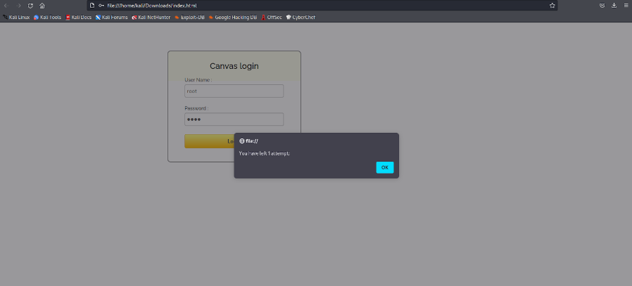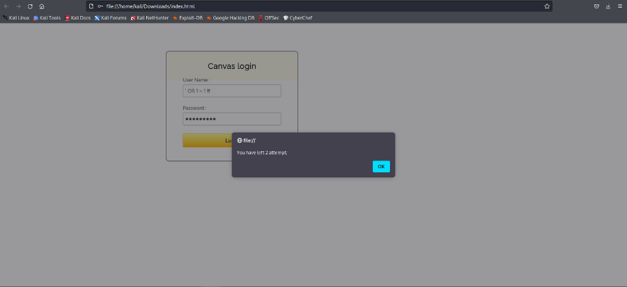 Setelah saya mengunzip file canvas.zip ternyata terdapat file index.html yang ketika dibuka merujuk kepada sebuah halaman log in. Disini saya pertama-tama menggunakan command SQL Injection ‘ OR 1 = 1 # dengan password yang random. Dan ternyata hal tersebut tidak bisa dilakukan dan hanya menyisakan 2 kesempatan lagi untuk melakukan login.