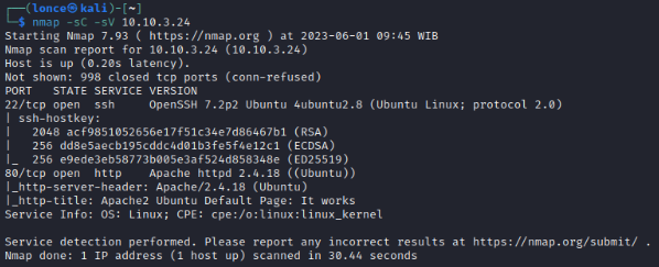 Pertama saya akan scan port menggunakan nmap, commandnya seperti berikut: