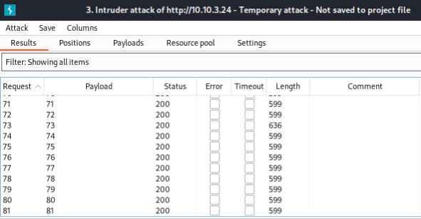 Saya menggunakan burpsuite untuk brute-force, check satu per satu.