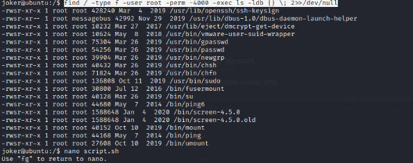 find / -type f -user root -perm -4000 -exec ls -ldb {} \; 2>>/dev/null