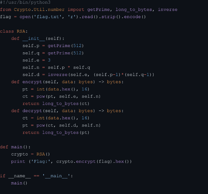 Nah kalau diperhatikan itu e nya = 3, sehingga hasil enkripsinya kemungkinan besar sangat kecil, bahkan lebih kecil dari n, sehingga hasil m^e itu tidak terpengaruhi oleh n, oleh karena itu, kita bisa langsung mengakarkannya saja untuk mendapatkan flagnya.