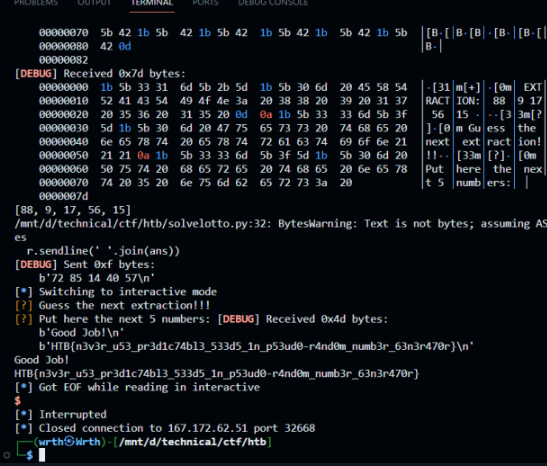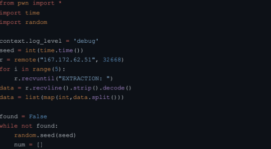 Bisa diperhatikan bahwa seed dari random generator itu adalah time.time(), sehingga kita bisa mengambil time saat connect ke nc untuk mendapatkan seed yang sama dan mendapatkan solutionnya
