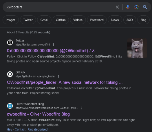 Oke sekarang kita lanjut ke task 4 yang nanya emailnya owoodflint apa. Setelah otak atik twitternya ternyata no clue, jadi kita back ke search page sebelumnya dan kita buka githubnya.