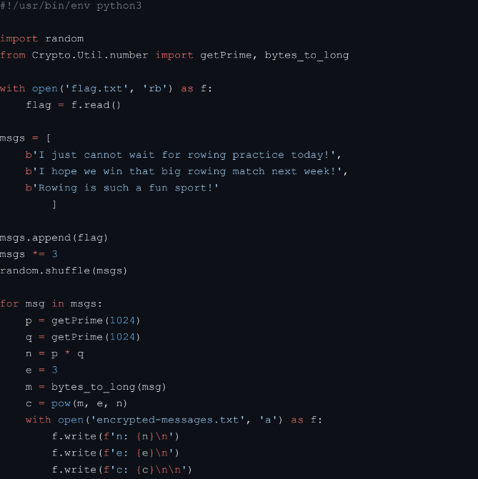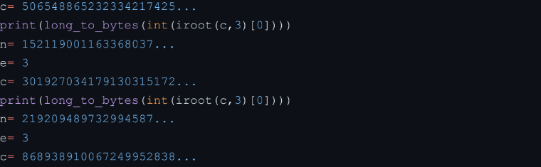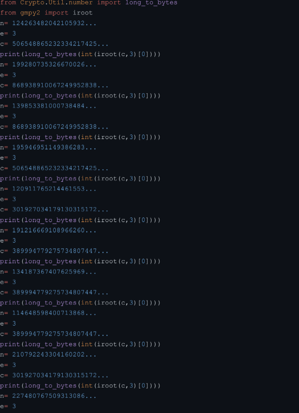 Disini vuln nya simpel aja, hanya m**e < n sehingga modulus nya tidak terpakai. Jadi tinggal ambil akar pangkat 3 dari tiap pesan untuk dapat pesannya