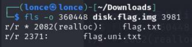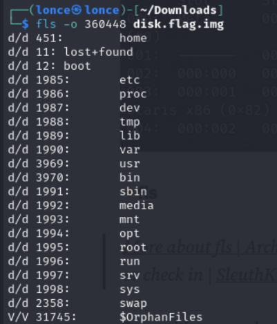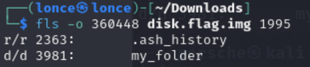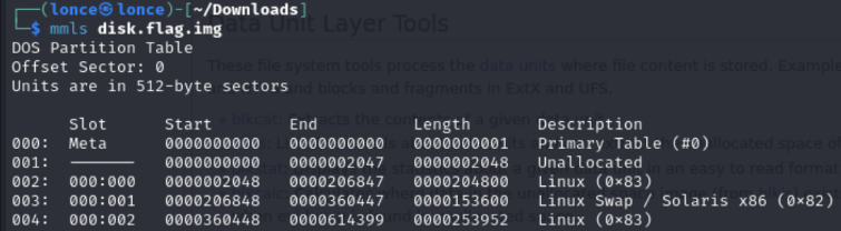 Pertama dump partion table dengan command ‘mmls’ dan mencari offsetnya yang akan digunakan untuk display list file dengan offset pada colom Start. Pada offset 2048 tidak ada isinya dan 206848 juga tidak ada output apapun. Pada offset 360448 terdapat list file.