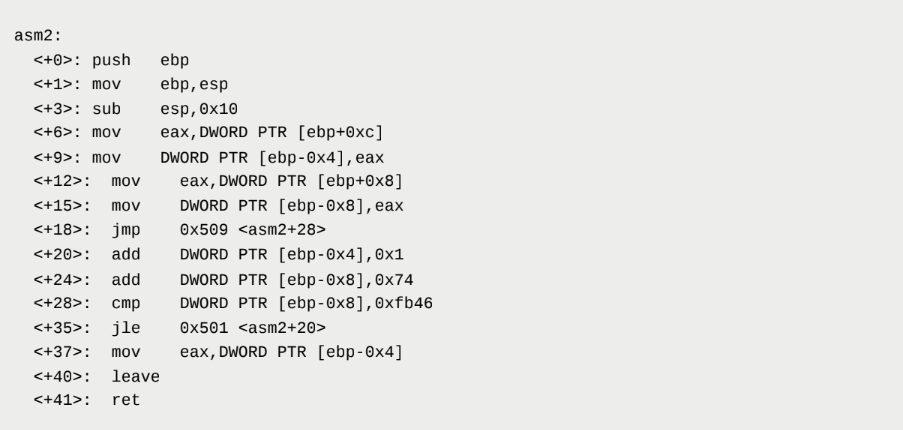 Kita lihat sekarang value dri ebp-0x8 adalah 0x4 dikarenakan 4 masih kurang dari 64326, kita harus melakukan iterasi ini hingga value dri ebp-0x8 lebih dari 64326.