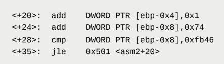 JIKA ebp - 0x8 lesser then or equal to 0xfb46 dia akan jump ke +20, untuk ditambahkan dan akan dilakukan terus hingga ebp-0x8 lebih dari 0xfb46